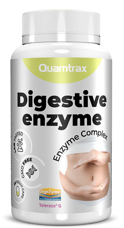Digestive Enzyme de Quamtrax es un potente complemento alimenticio a base de un complejo enzimático de amplio espectro que ayuda a descomponer eficientemente los macronutrientes esenciales: carbohidratos, proteínas y grasas, facilitando su absorción y mejorando la salud digestiva. Formulado con el reconocido complejo Digezyme® y potenciado con extracto de cúrcuma y Tolerase™, este suplemento puede desempeñar un papel clave en la mejora de la digestión y la optimización de la biodisponibilidad de los nutrientes, ayudando a reducir los síntomas de indigestión y aumentando la energía obtenida de los alimentos.