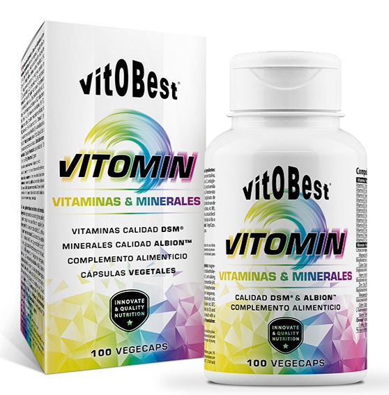 Vitomin, de Vitobest®, es una novedosa fórmula elaborado a partir de vitaminas (A, C, D3, E, B1, B2, B3, B5, B6, B9, B12 y biotina) (DSM®) y minerales [citrato de magnesio (Albion™), bisglicinato de calcio (Albion™), bisglicinato de hierro (Ferrochel™) (Albion™), bisglicinato de zinc (Albion™), bisglicinato de manganeso (Albion™), gluconato de cobre, L-Selenometionina y picolinato de cromo (Chomax®)].